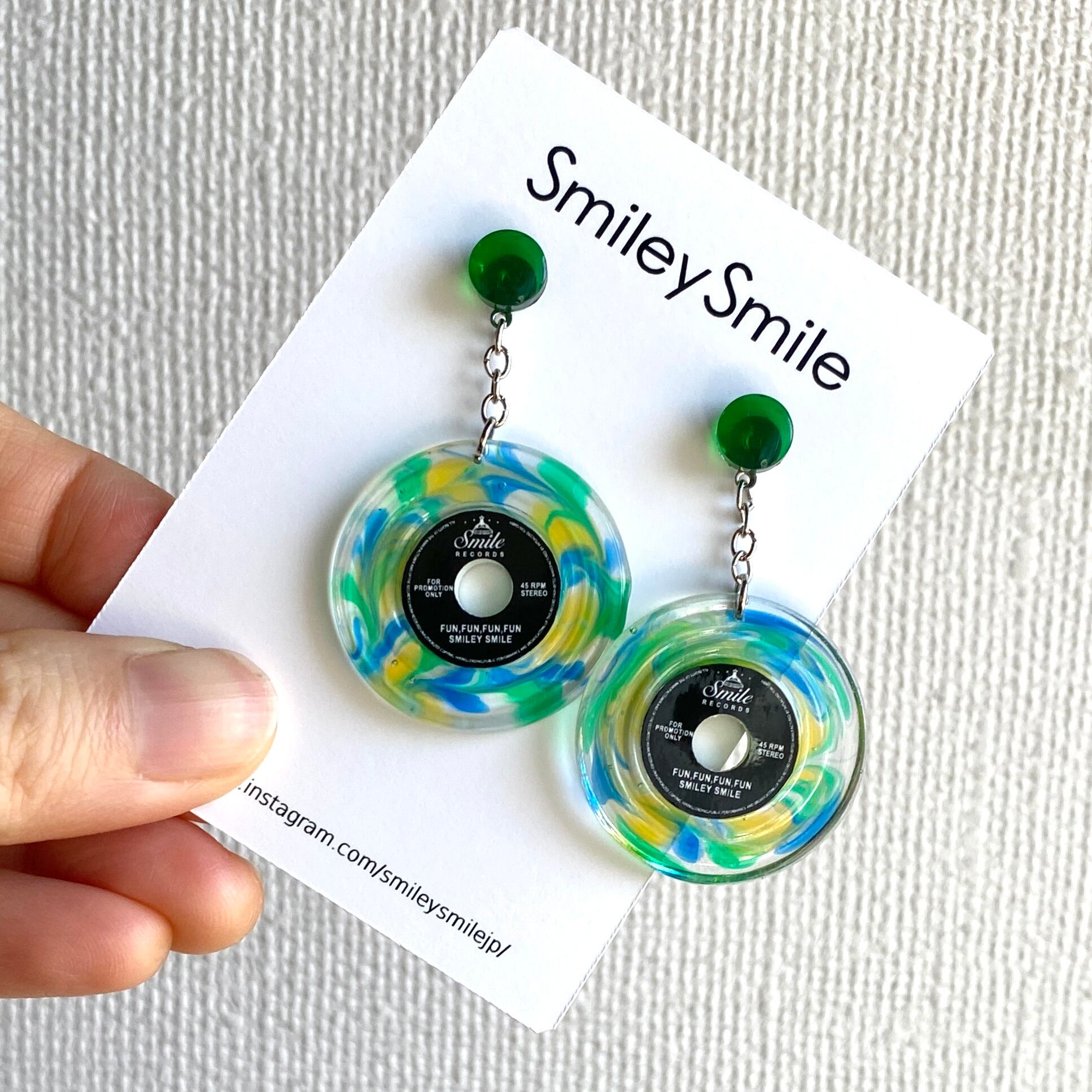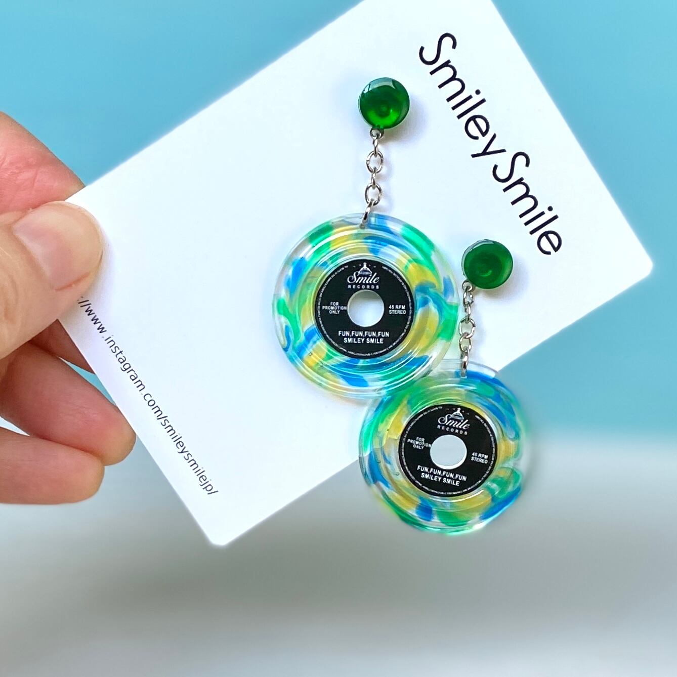 レコードピアス/イヤリング【飾り付き】クリア×グリーン×イエロー×ブルー